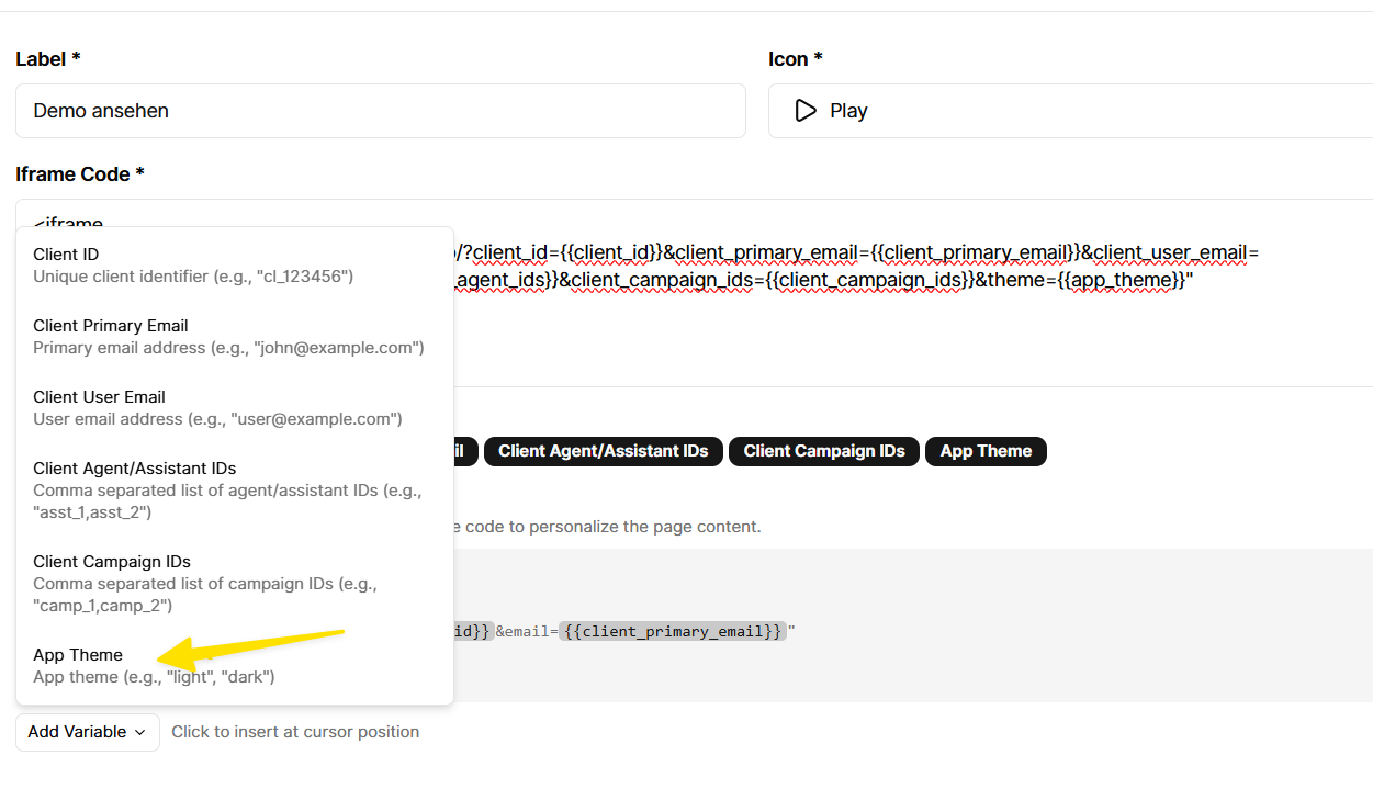 Use this variable to dynamically access the client portals theme (e.g., "light" or "dark") in your custom page item configuration. This allows you to create theme-aware custom iframe page that adapts to the user's theme preference.