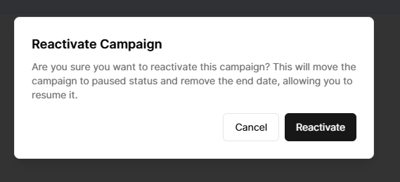 Now you get the option to reactivate campaigns that have ended. Reactivating will move the campaign to a paused status and then when you remove the end date, it will allow you to resume the campaign.