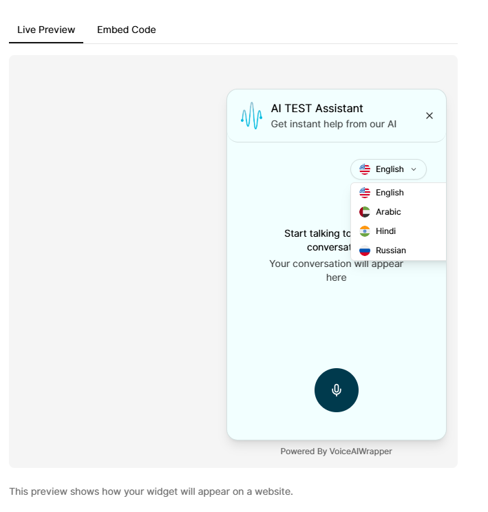 • If the ElevenLabs agent supports more languages, the widget can also show additional supported languages.