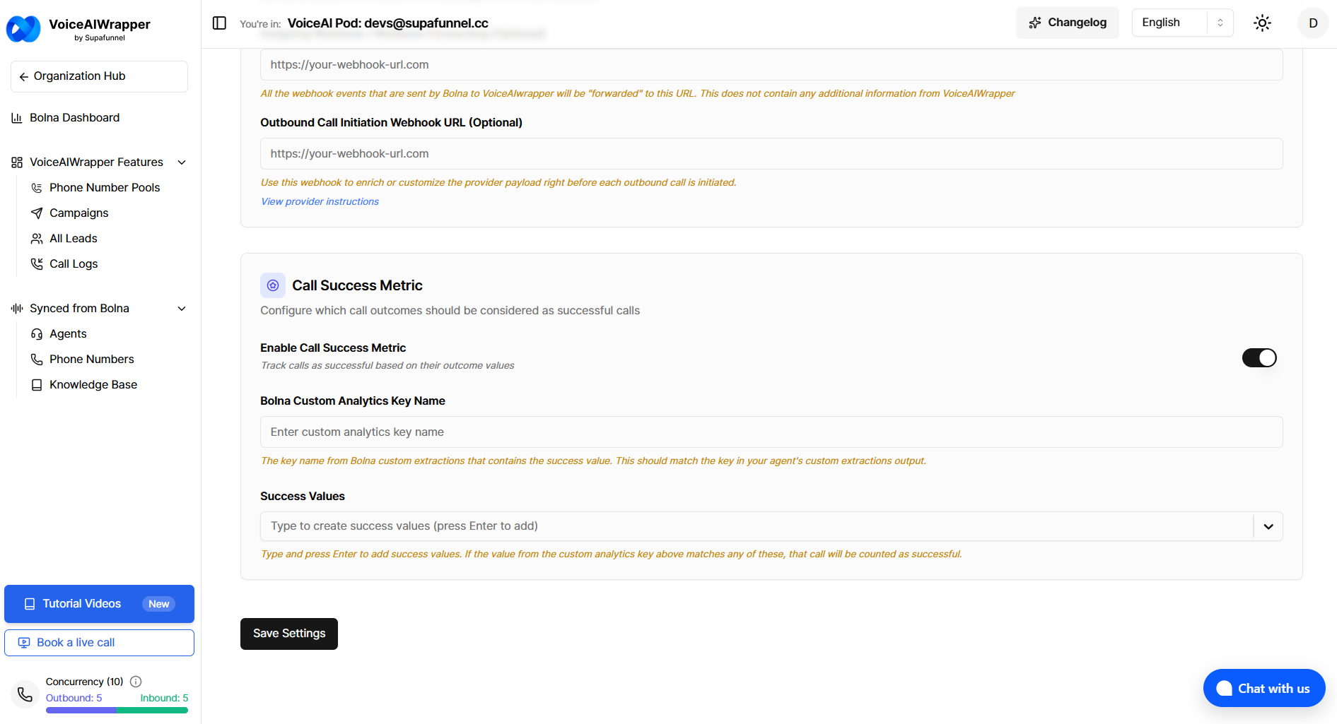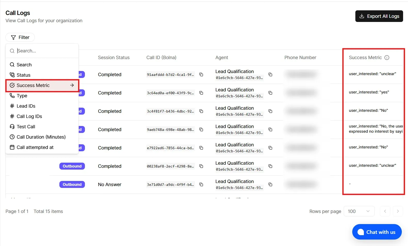 • Table column: Call Logs now includes a Success Metric column for Bolna. It shows the value from your campaign’s Bolna custom analytics field (the same key you set for call success on the campaign), pulled from that call’s custom extractions.