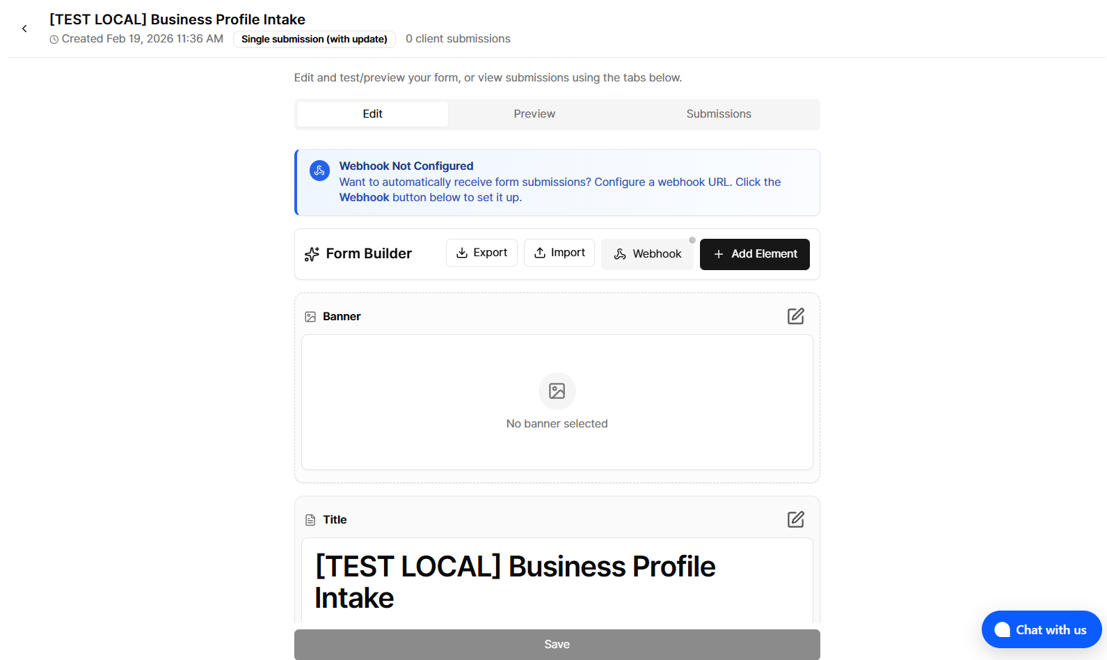 • Form content — Title, description, banner, all supported field types, and their configuration (labels, placeholders, options, validation, etc.).