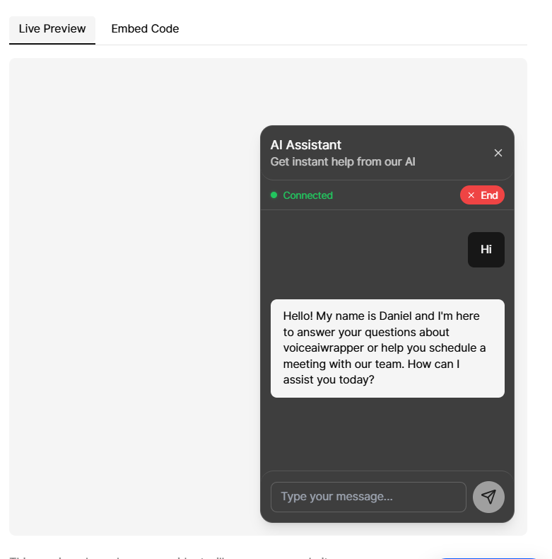 You can configure chat and voice simultaneously (both enabled), or choose either chat-only or voice-only modes. Visitors can chat with your AI agent directly on your website without voice calls. For VAPI, the same assistant can be used for both voice and chat; you can set a dedicated chat assistant in widget settings or leave it to fall back to the voice assistant.