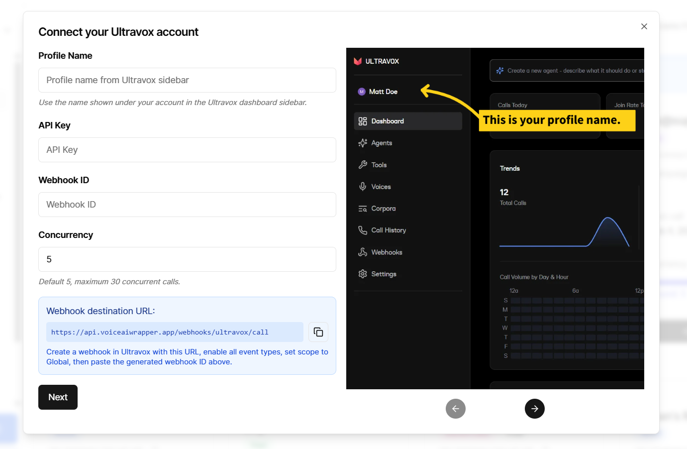 Go to Voice Providers, add your Ultravox API key, and use the webhook URL we provide. Ultravox sends call events to that endpoint — it needs to be set correctly for statuses, transcripts, and recordings to appear in the app.