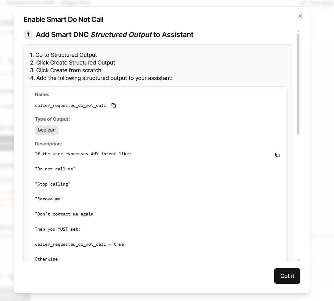 Add a boolean field named caller_requested_do_not_call to your agent's post-call analysis. Where you add it depends on your provider: