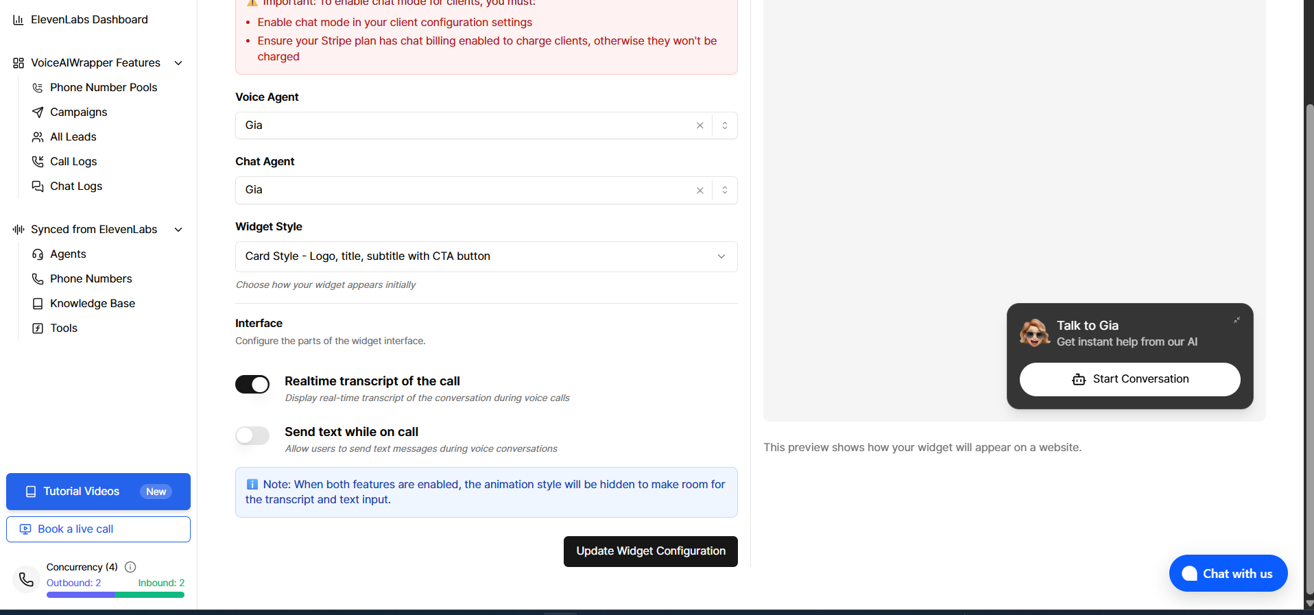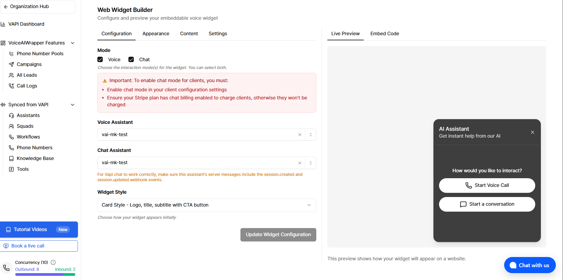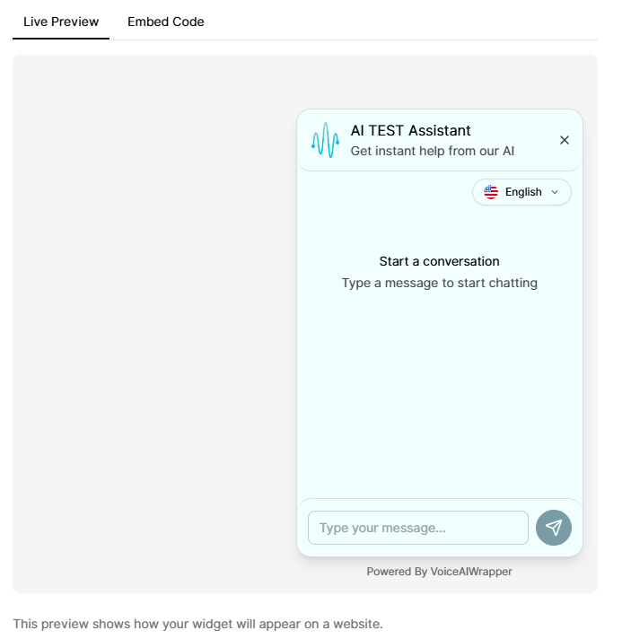 You can configure chat and voice simultaneously (both enabled), or choose either chat-only or voice-only modes. Visitors can chat with your AI agent directly on your website without voice calls. For VAPI, the same assistant can be used for both voice and chat; you can set a dedicated chat assistant in widget settings or leave it to fall back to the voice assistant.
