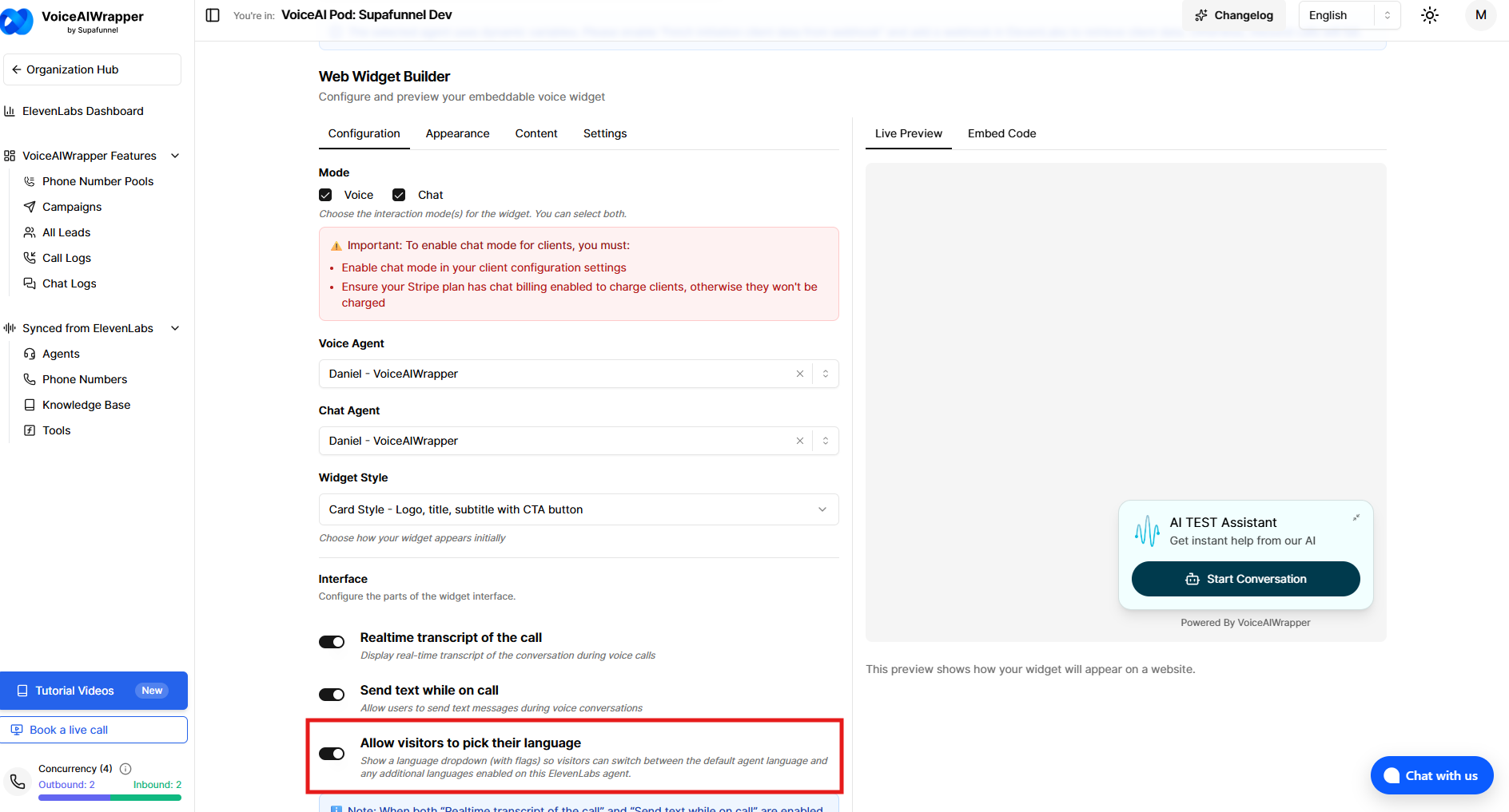 In the widget builder, enable “Allow visitors to pick their language” for your ElevenLabs widget.