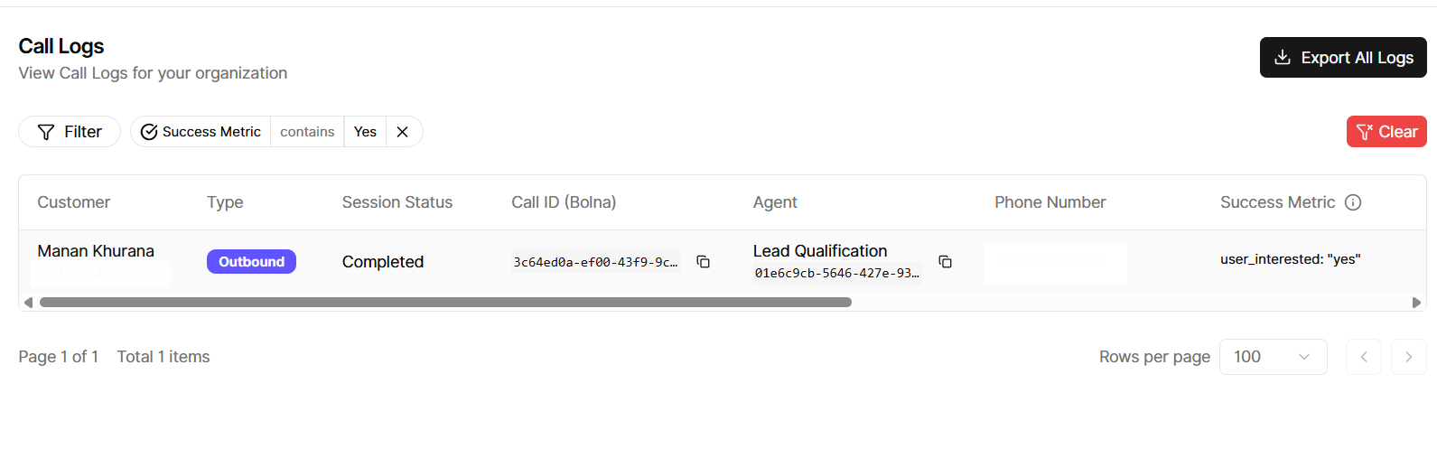 Table column: Call Logs now includes a Success Metric column for Bolna. It shows the value from your campaign’s Bolna custom analytics field (the same key you set for call success on the campaign), pulled from that call’s custom extractions.
