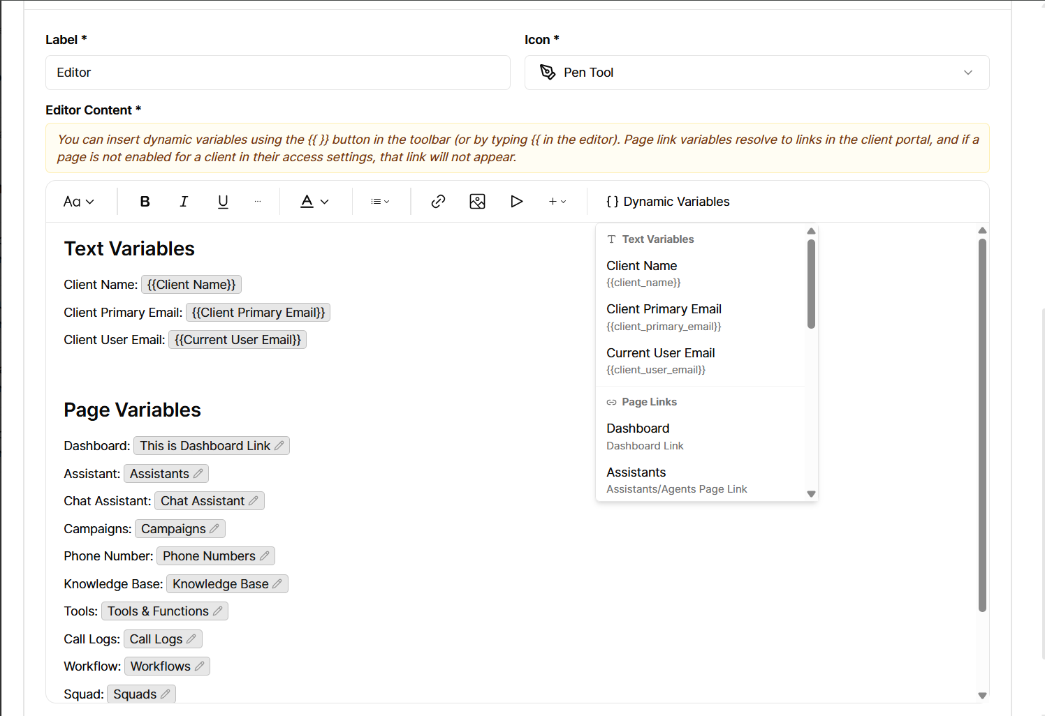For Custom menu items of type Editor page (rich content / custom page), the editor toolbar now includes Dynamic variables.