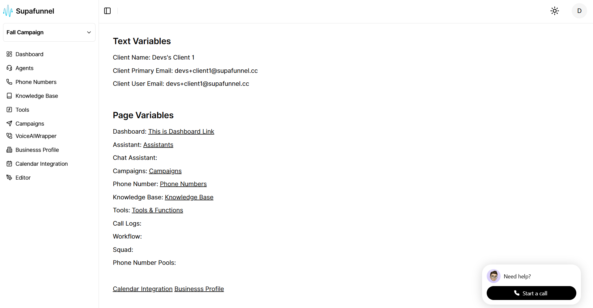 Portal links: quick links to areas like Dashboard, Assistants, Chat assistant, Campaigns, Phone numbers, Knowledge base, Tools, Call logs, Workflows, Squads, and Phone number pool.