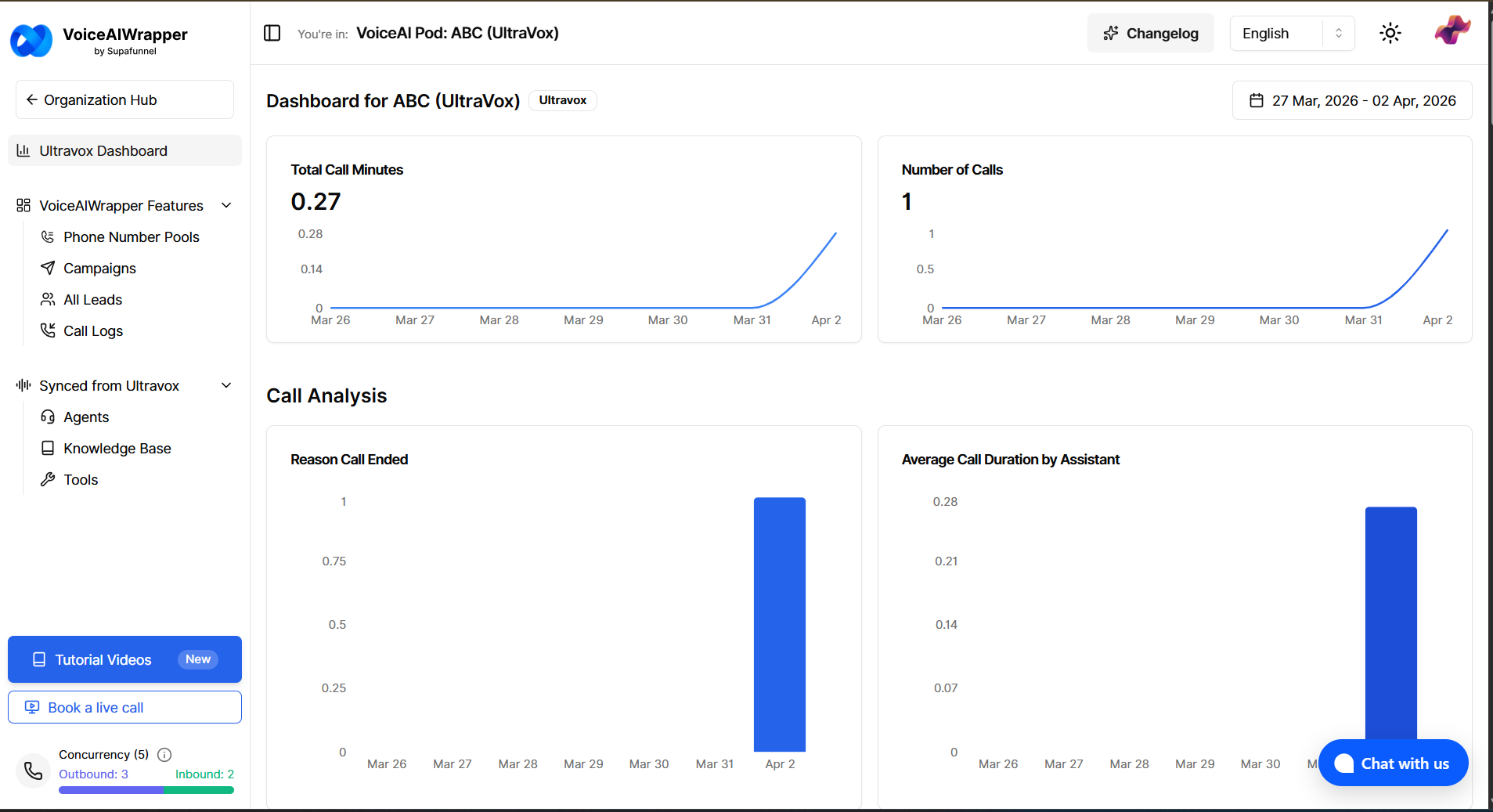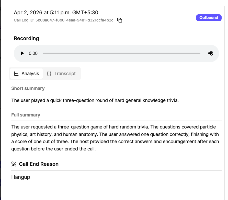 Calls show up in the call log with status, duration, transcript/summary (when available from Ultravox), and a recording link where applicable.