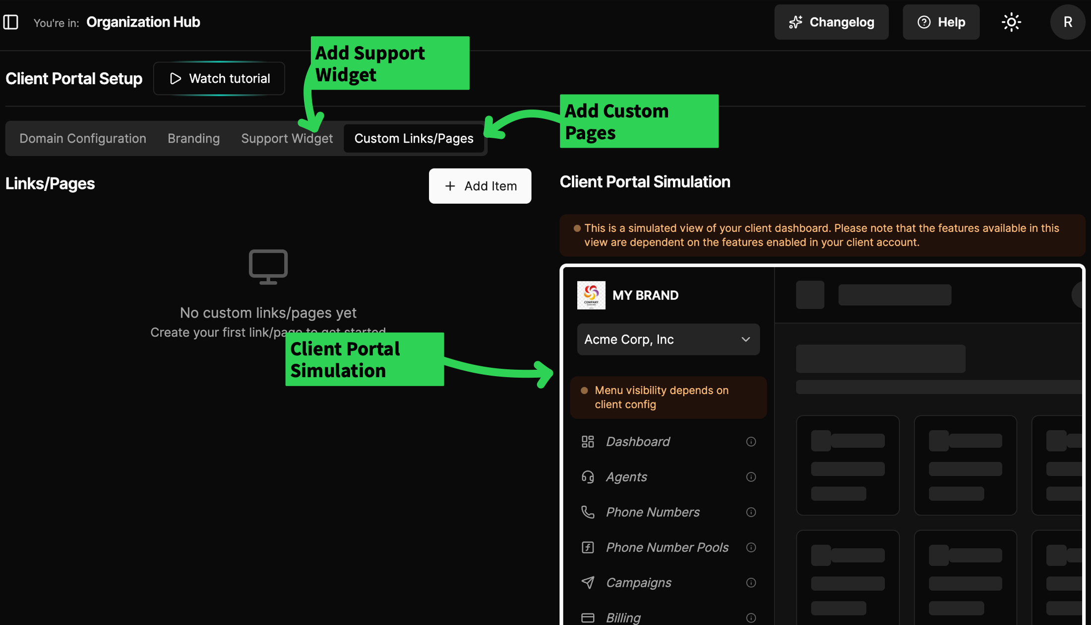 Now add a widget to your client portal (e.g. a chat support widget) and Custom Pages or Links (e.g. FAQ page, Onboarding Workflow etc)