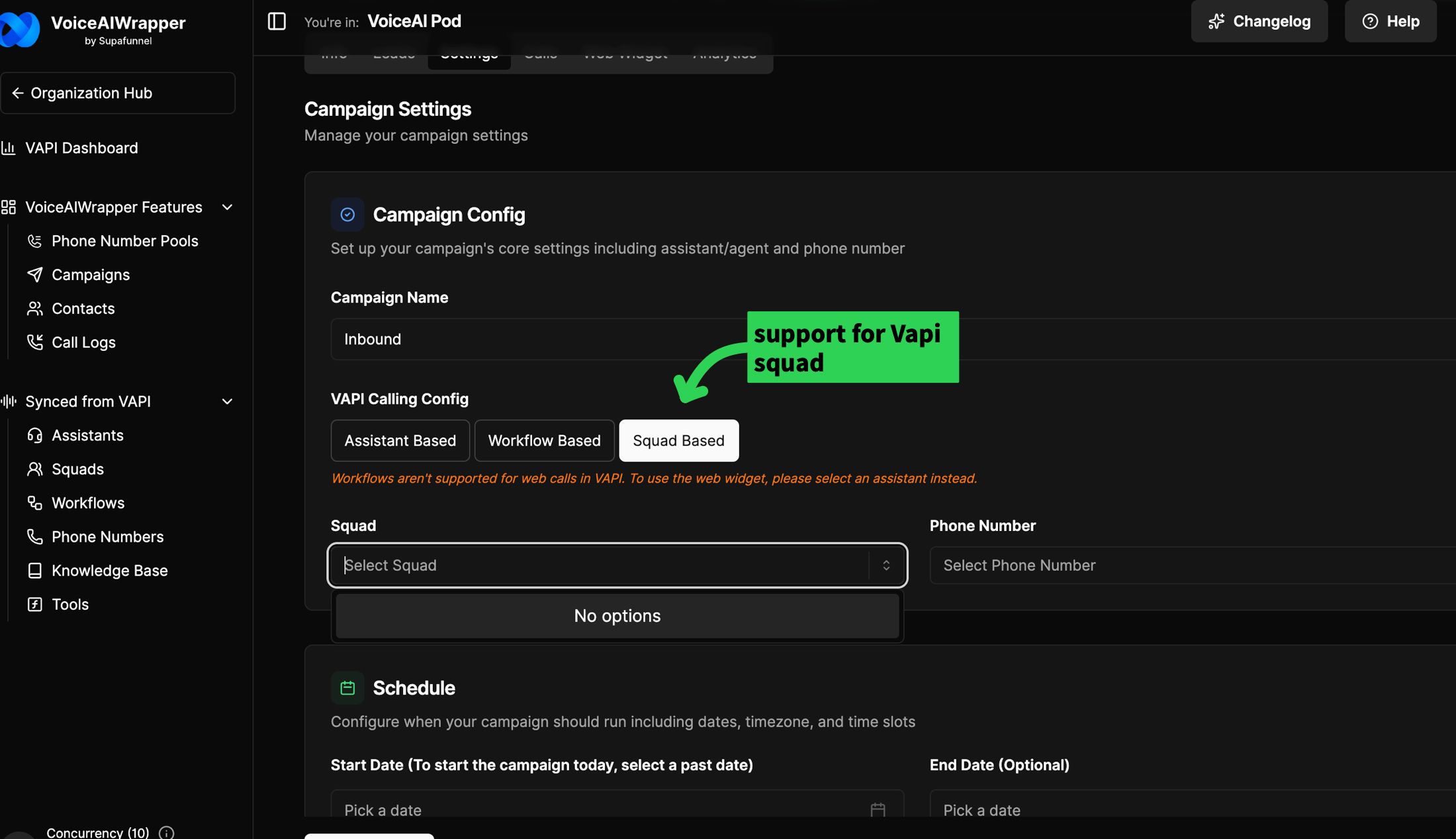We have just released support for Vapi Squad. You can access it under Campaigns>Campaign Config>Vapi Calling Config